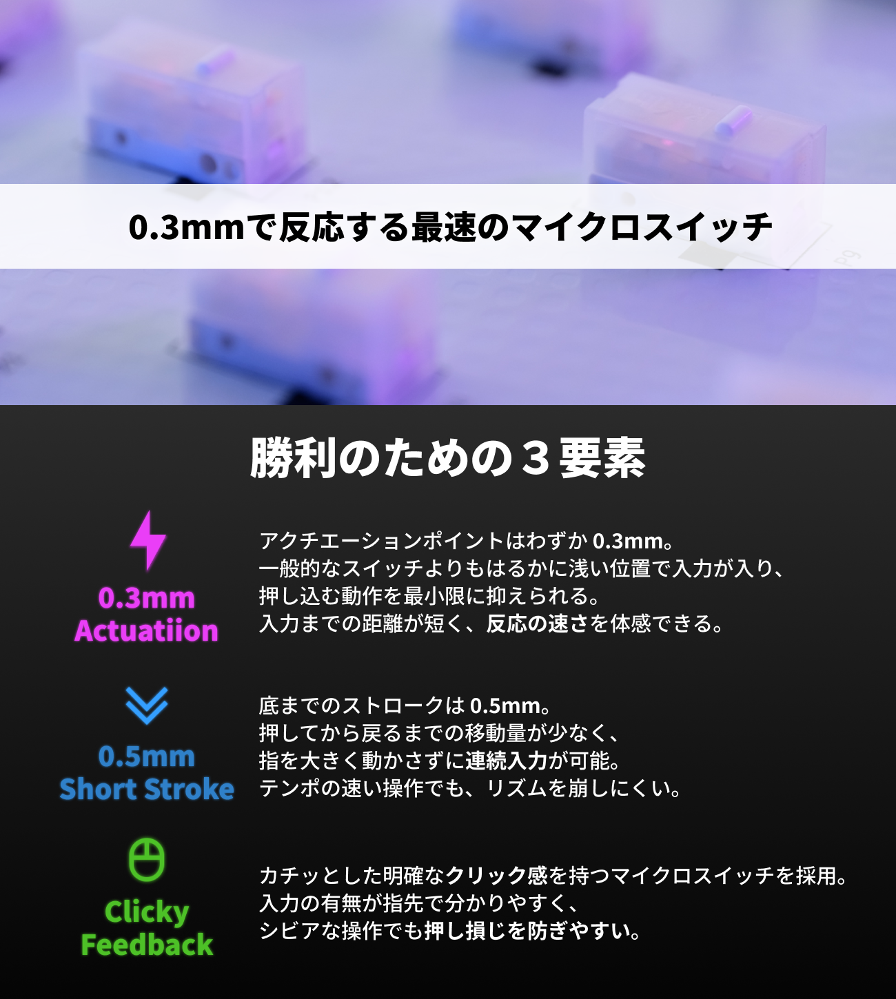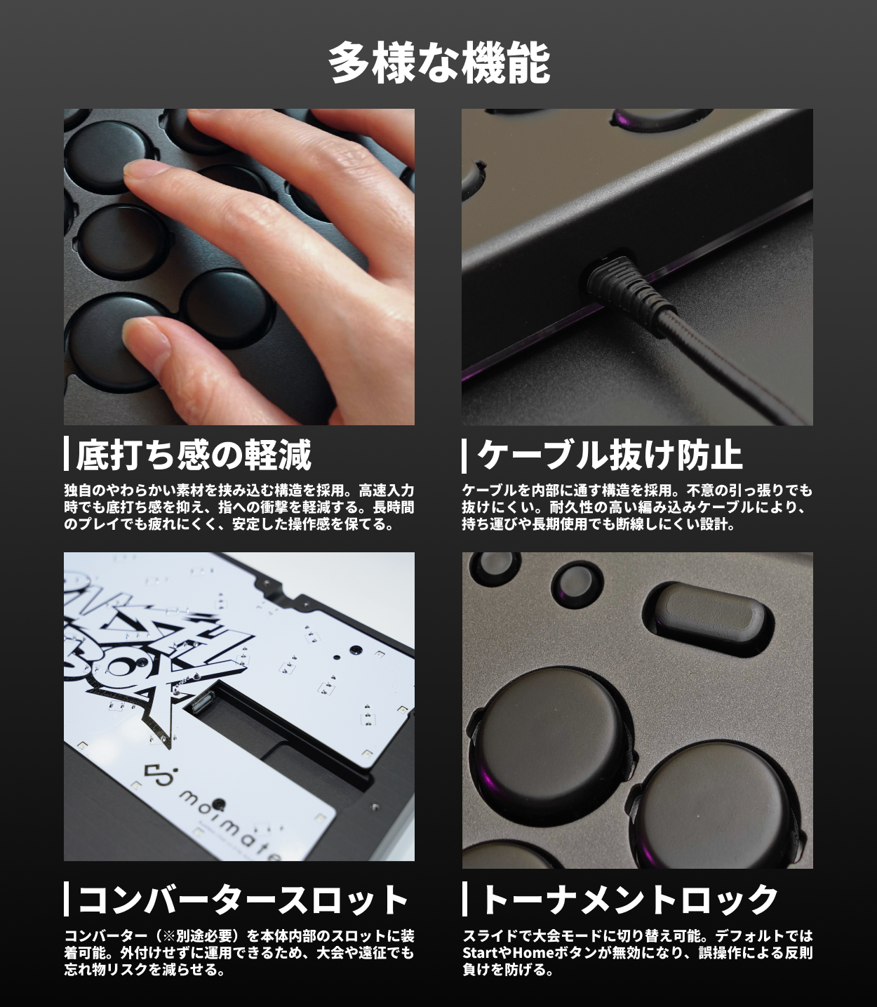 ✅ アクチュエーションポイント0.3mmの応答性✅ 最大22+2ボタンから作れる自由なレイアウト✅ 底打ち感を軽減した柔らかな押し心地✅ 咄嗟の操作にも均一に反応するクリック感22ボタンからボタン配置をカスタマイズできる自由度の高さで、「ストリートファイター6」「鉄拳8」「GUILTY GEAR -STRIVE-」「2XKO」にも最適なレバーレスコントローラーです。