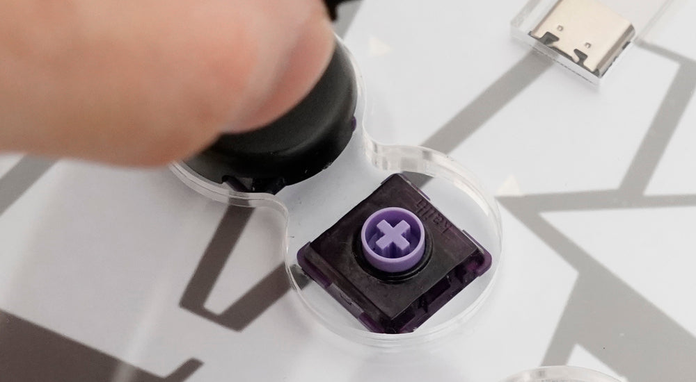 浅い入力で素早く反応する静音スイッチ「Purple Swallowtail」を採用。軽いタッチで連打や同時押しがラクにできる。横一列の移動ボタンでスライド入力にも対応。